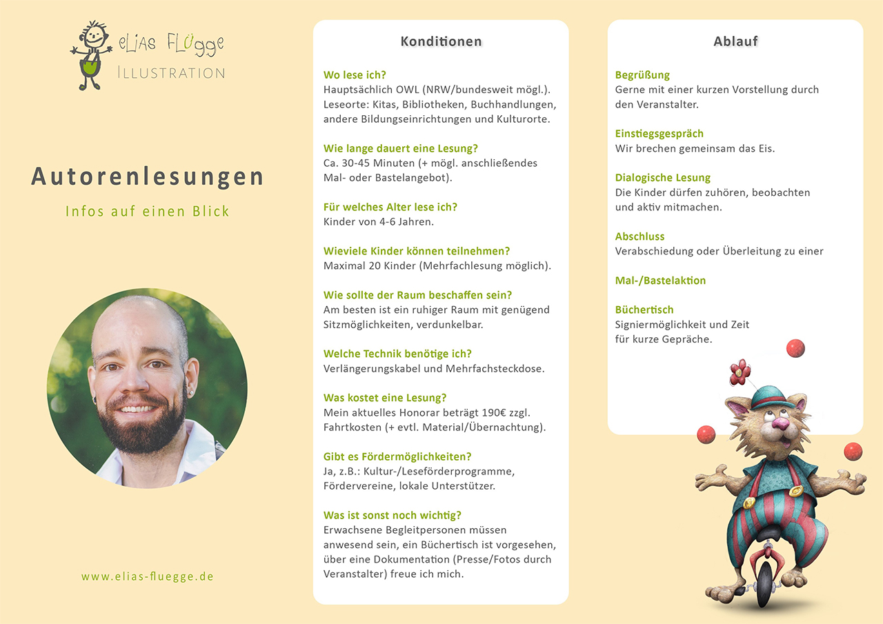 Die Lesung beginnt mit einer kurzen Vorstellung, gerne durch den Veranstalter. So können die Kinder ankommen und einen ersten Bezug zur Person hinter dem Buch herstellen.